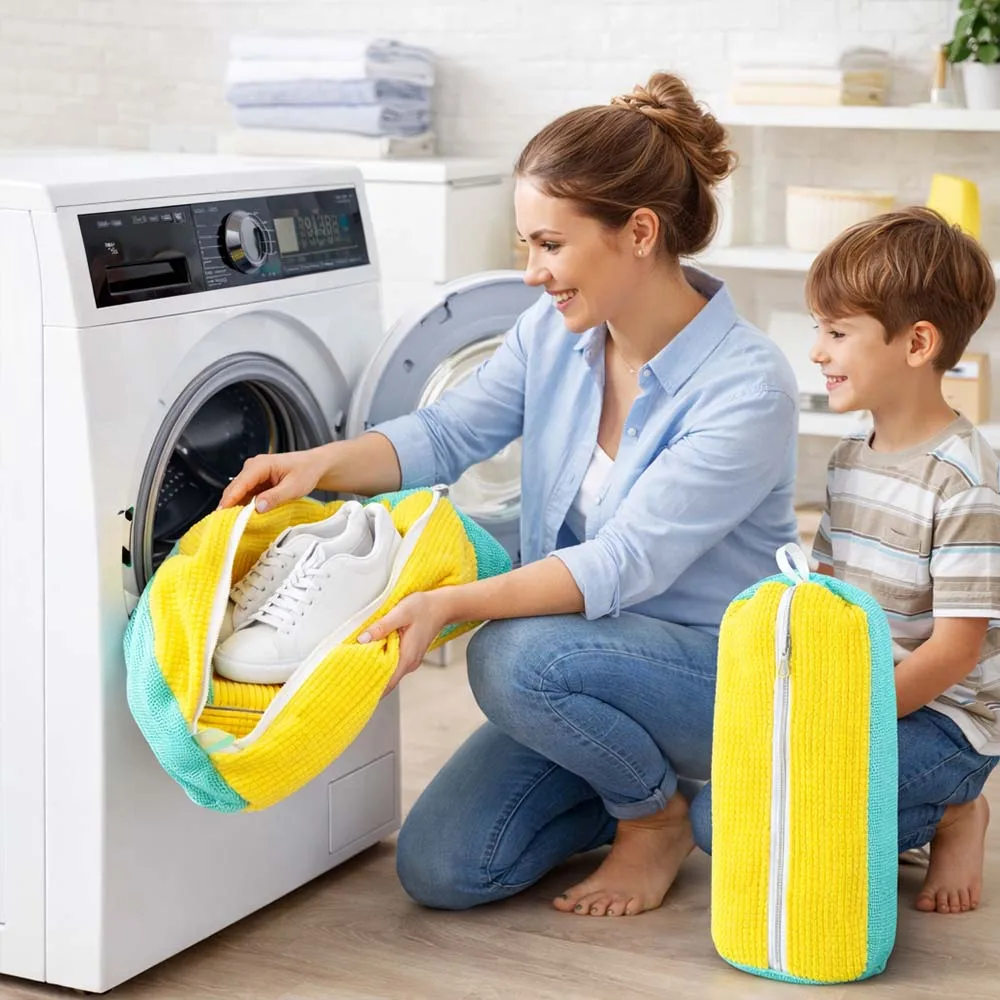 Thickened mesh lets suds through but blocks scratches—chenille lining is soft like a hug for your soles. Zipper seals tight so nothing escapes, even on spin cycle. Doubles as travel storage to keep pairs dust-free on the go.