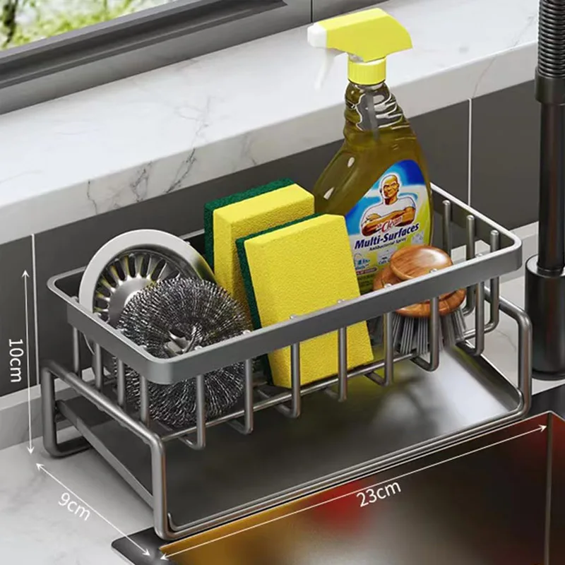 This kitchen sink organizer provides a simple way to hold and separate kitchen gadgets near the sink, keeping them in one designated spot for easy reach and use.