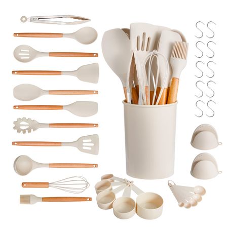 – 6 utensils: solid spoon, slotted spoon, solid spatula, slotted spatula, tongs, skimmer